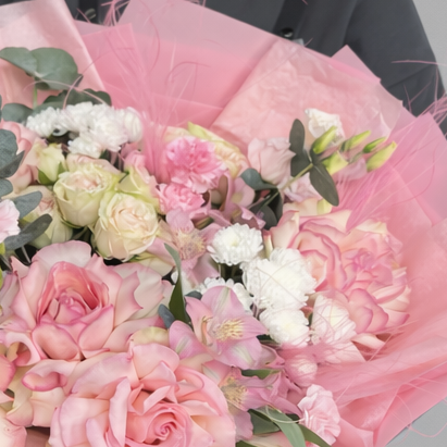 Букет из французских и кустовых роз, хризантем и эустомы в нежной розовой упаковке — это роскошная цветочная композиция, которая идеально подойдет для яркого и запоминающегося подарка. Пышные французские розы создают яркий акцент, кустовые розы придают объем и нежность, хризантемы создают букет, а эустома придает композиции легкость и утончённость.