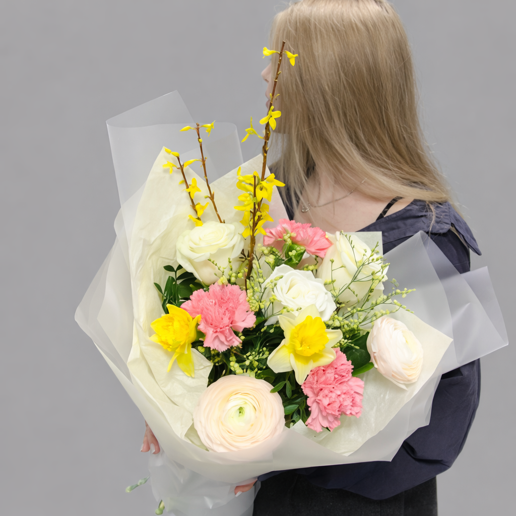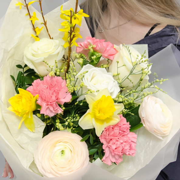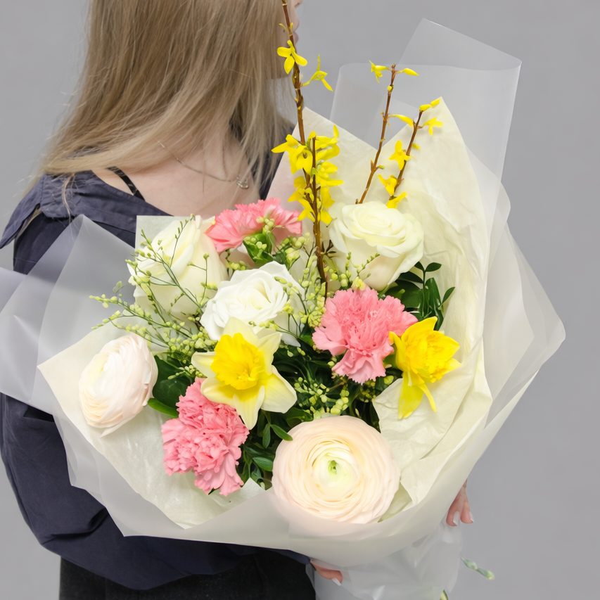 Этот букет — воплощение утончённости и лёгкости. Белые розы создают благородную основу композиции, нежные ранункулюсы добавляют объём и текстуру, солнечные нарциссы придают весеннее настроение, а веточки форзиции делают букет живым и по-настоящему сезонным.