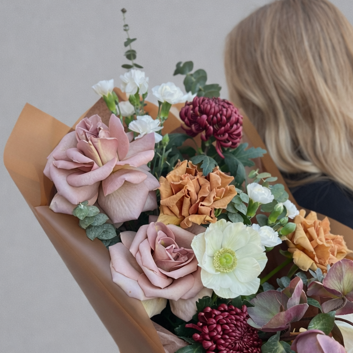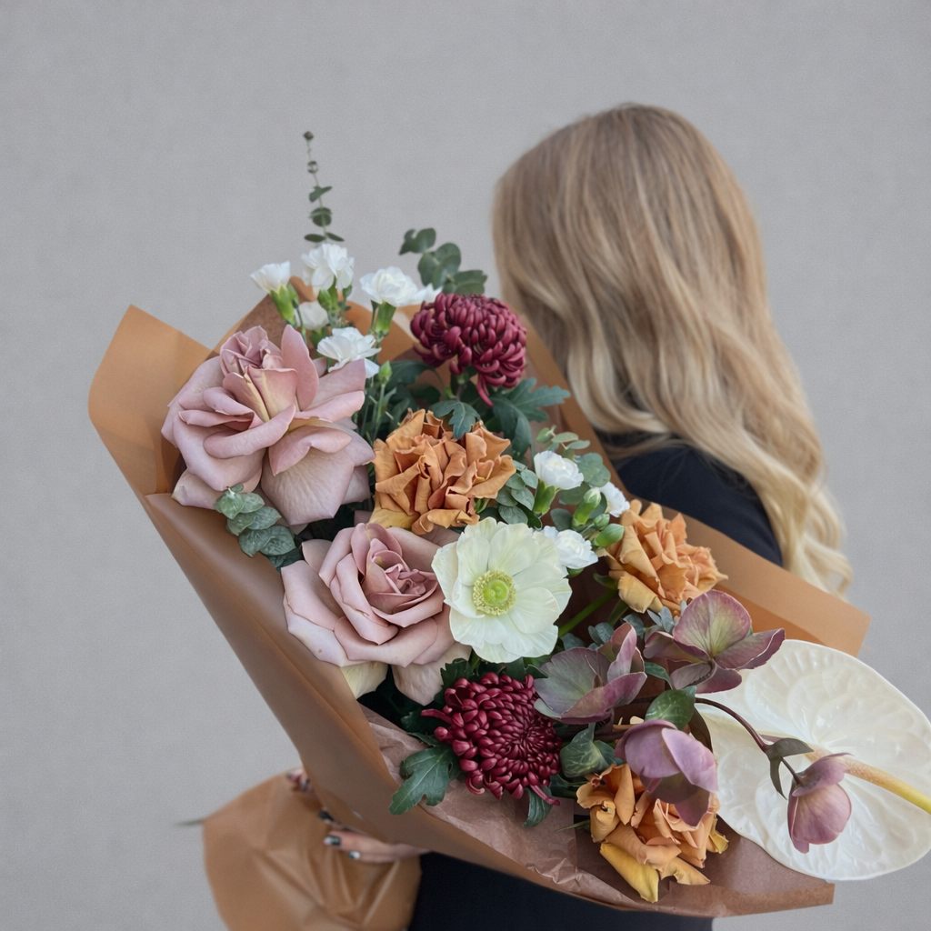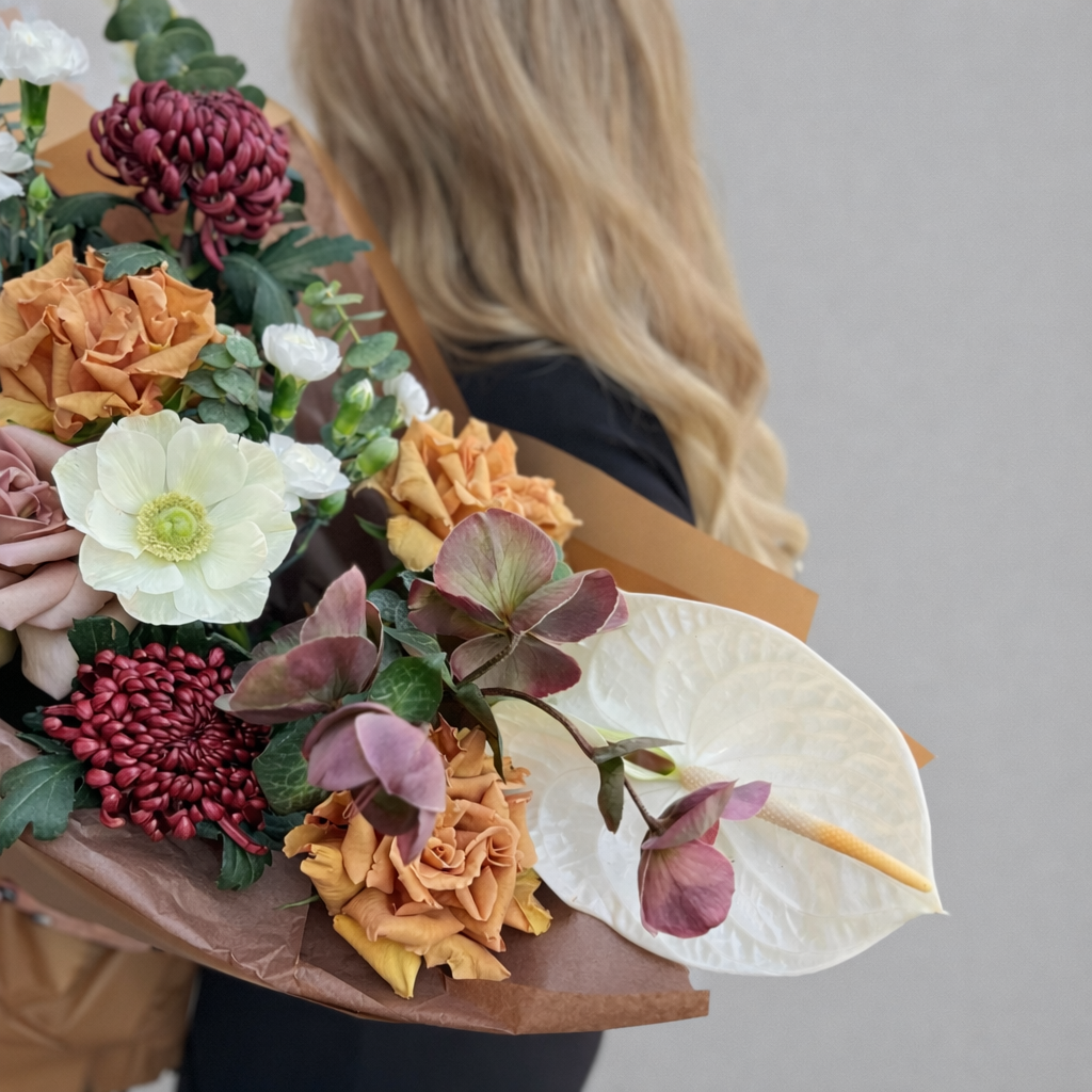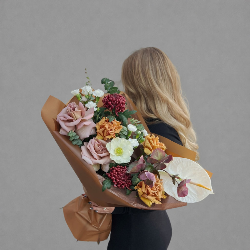 Особое настроение букету придают экзотические цветы, которые делают композицию более редкой и выразительной. Антуриум и анемон создают интересный контраст с французскими розами и хризантемами бигуди, а шоколадная упаковка подчеркивает глубину оттенков и усиливает ощущение премиальности. Такой букет выглядит современно и отличается от более классических вариантов.