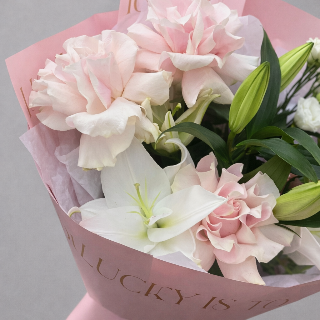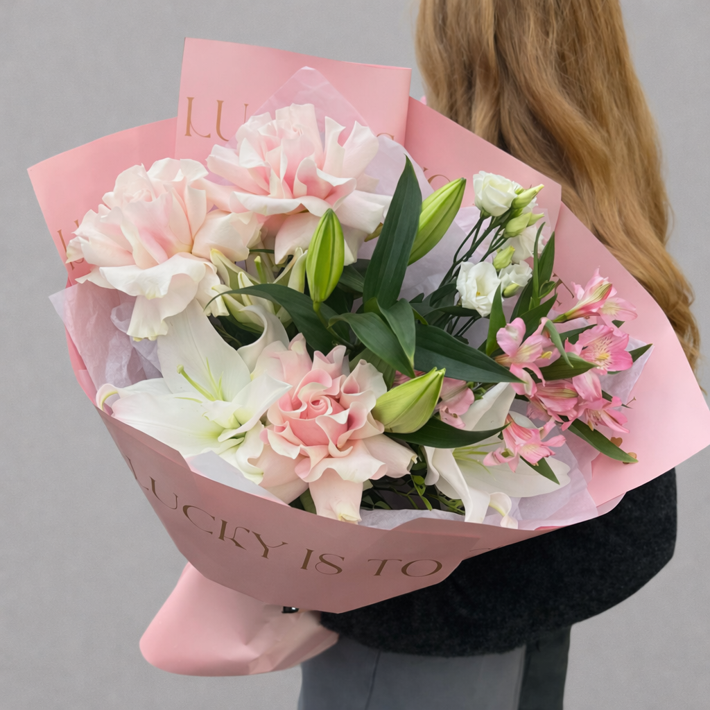 Элегантный букет из лилий, французских роз и эустомы — изысканная композиция в нежной розовой упаковке для особенного повода. Крупные ароматные лилии придают букету выразительность, французские розы добавляют романтичности и благородства, а воздушная эустома создаёт лёгкость и объём.