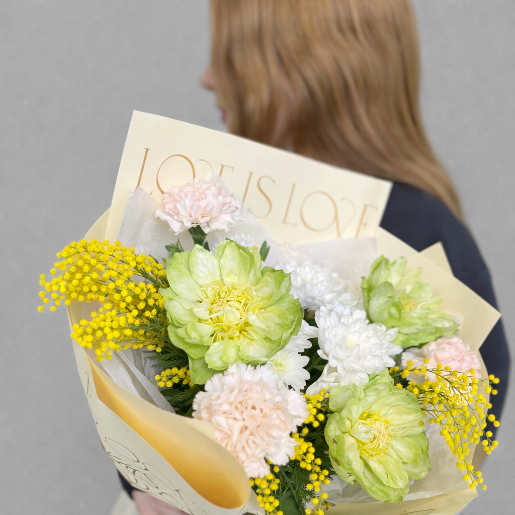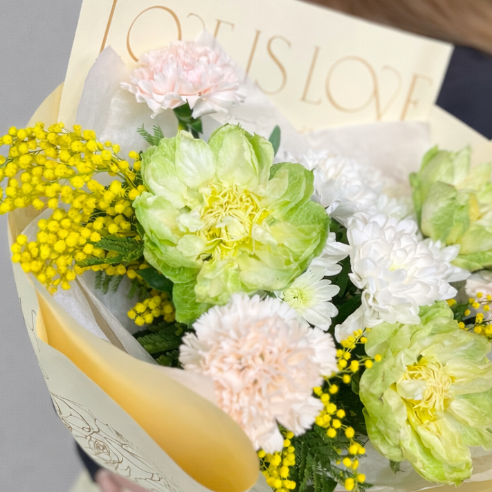 Яркий и стильный букет из роз Вегги, гвоздик и мимозы — это необычное сочетание нежных пастельных оттенков и солнечных акцентов. Пионовидные розы Вегги с легким салатово-кремовым оттенком выглядят современно и эффектно, воздушные гвоздики добавляют мягкости, а пушистая мимоза наполняет композицию теплом и весенним настроением.