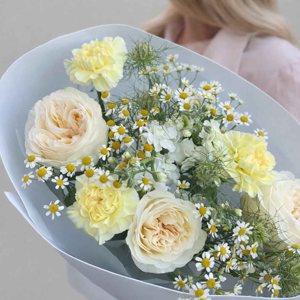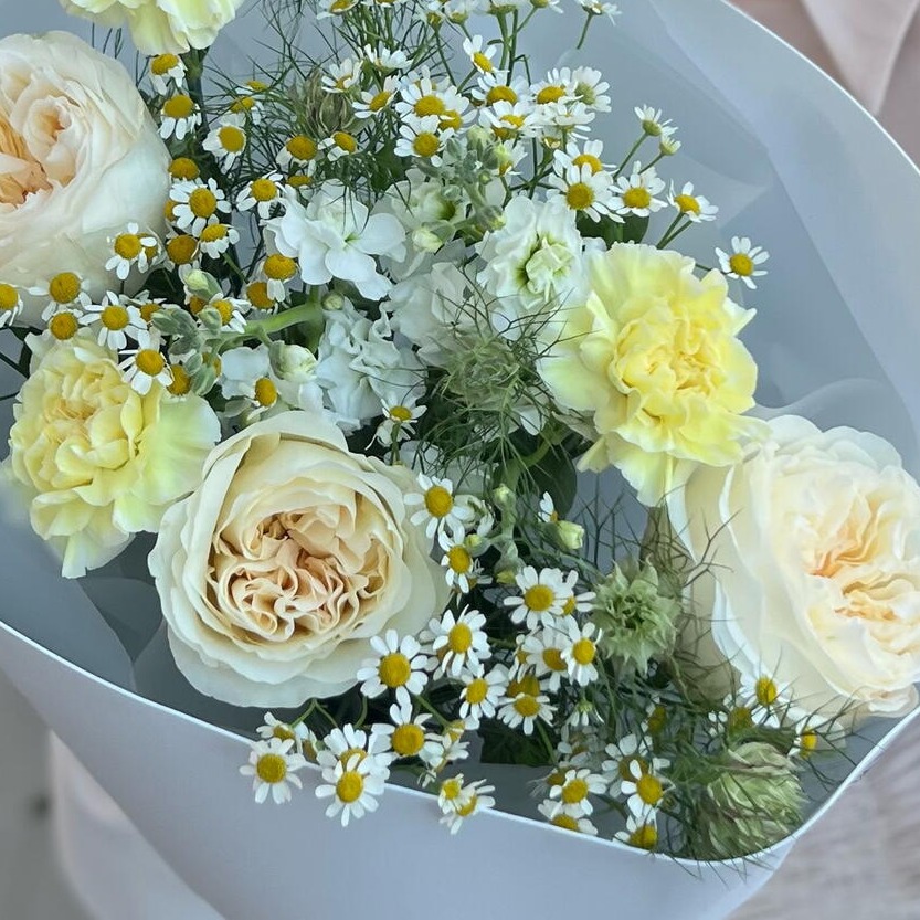 Этот букет сочетает в себе естественную красоту и современную флористику. Ромашки придают композиции легкость и искренность, пионовидные розы добавляют объем и романтичное настроение, диантусы делают букет более фактурным, а нигелла придает ему изящный и немного воздушный акцент. В результате получается гармоничный сборный букет, который выглядит свежо, стильно и уместно для любого случая.