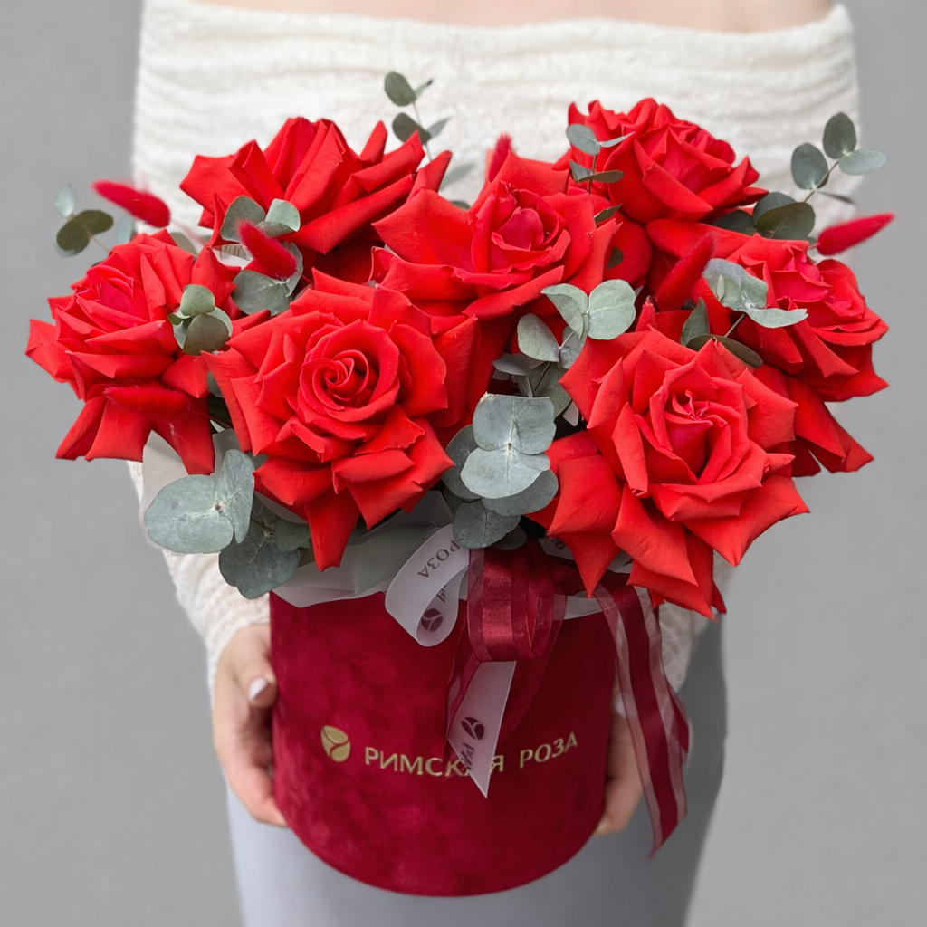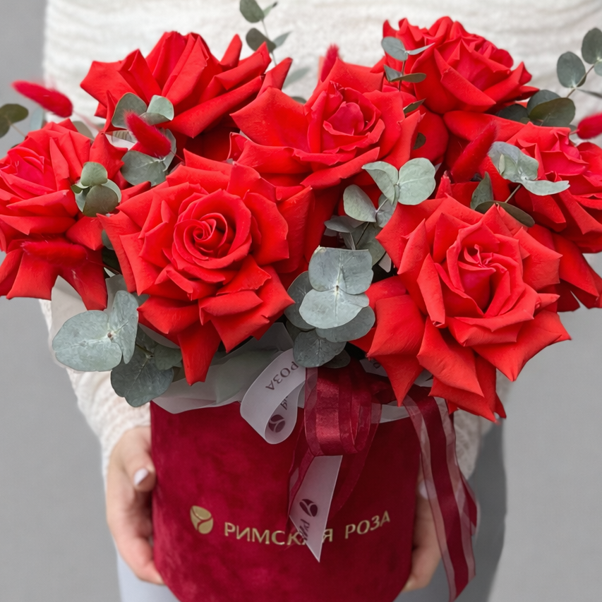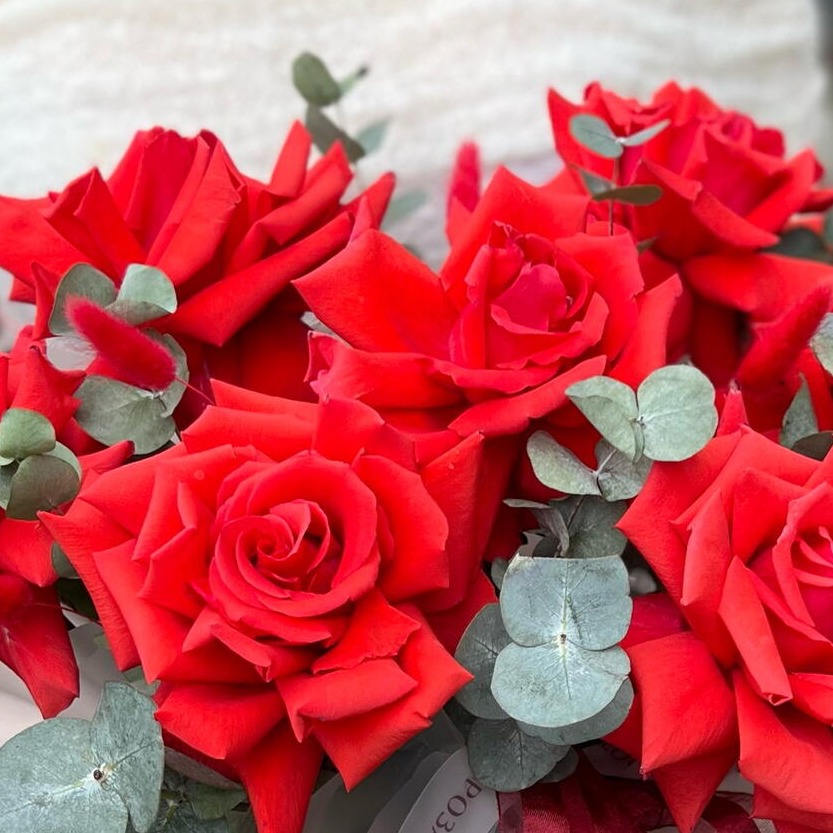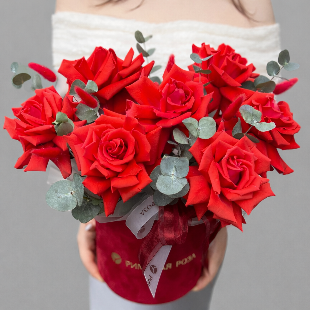 Французские красные розы в коробке с эвкалиптом — это красивая композиция, в которой классика раскрывается особенно стильно и современно. Насыщенный красный оттенок роз подчеркивает глубину чувств и делает подарок выразительным, а эвкалипт добавляет свежесть, лёгкость и фактурность. Такая композиция из роз в коробке выглядит аккуратно, дорого и подходит для тех, кто ценит эстетичную флористику и продуманную подачу.