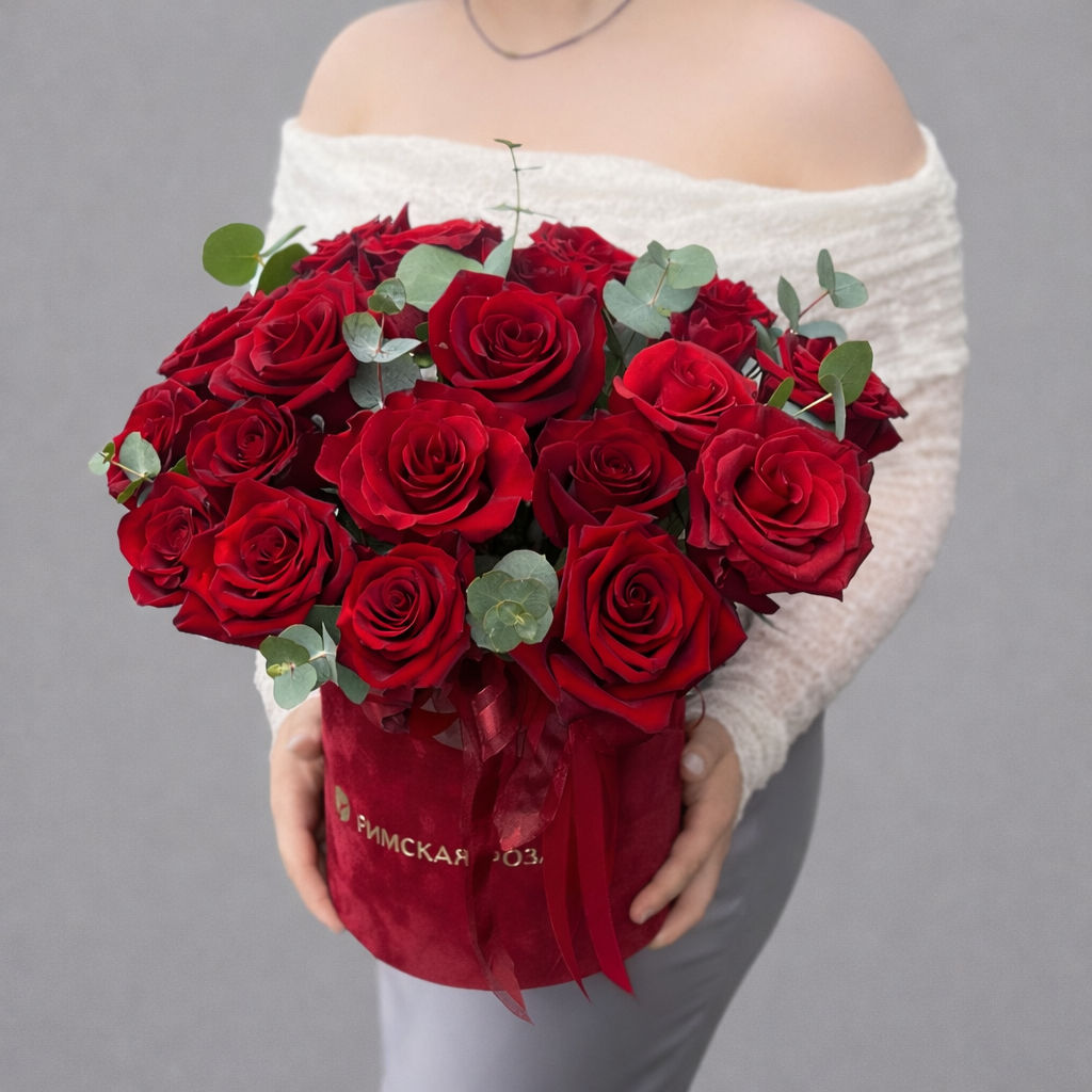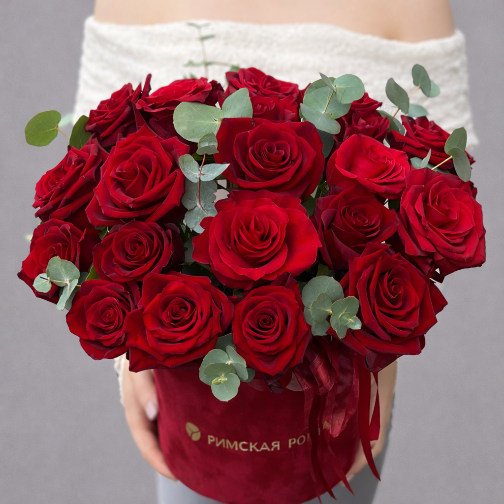 Эта композиция из красных роз создана для тех, кто хочет подарить сильные эмоции и сделать по-настоящему запоминающийся сюрприз. Алые розы в сочетании с эвкалиптом смотрятся выразительно, благородно и современно, а красная коробка усиливает эффект роскошной подачи. Такой подарок сразу привлекает внимание и создаёт тот самый WOW-эффект, который особенно важен для значимых событий и красивых признаний.