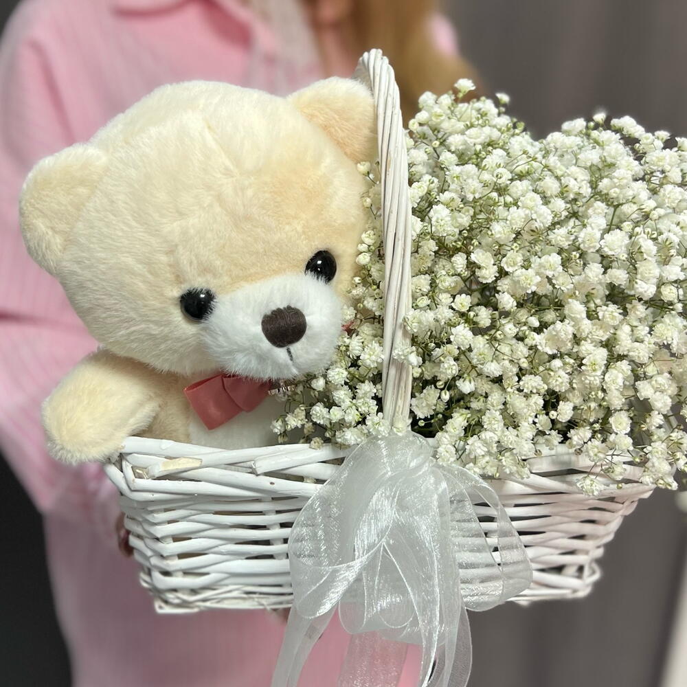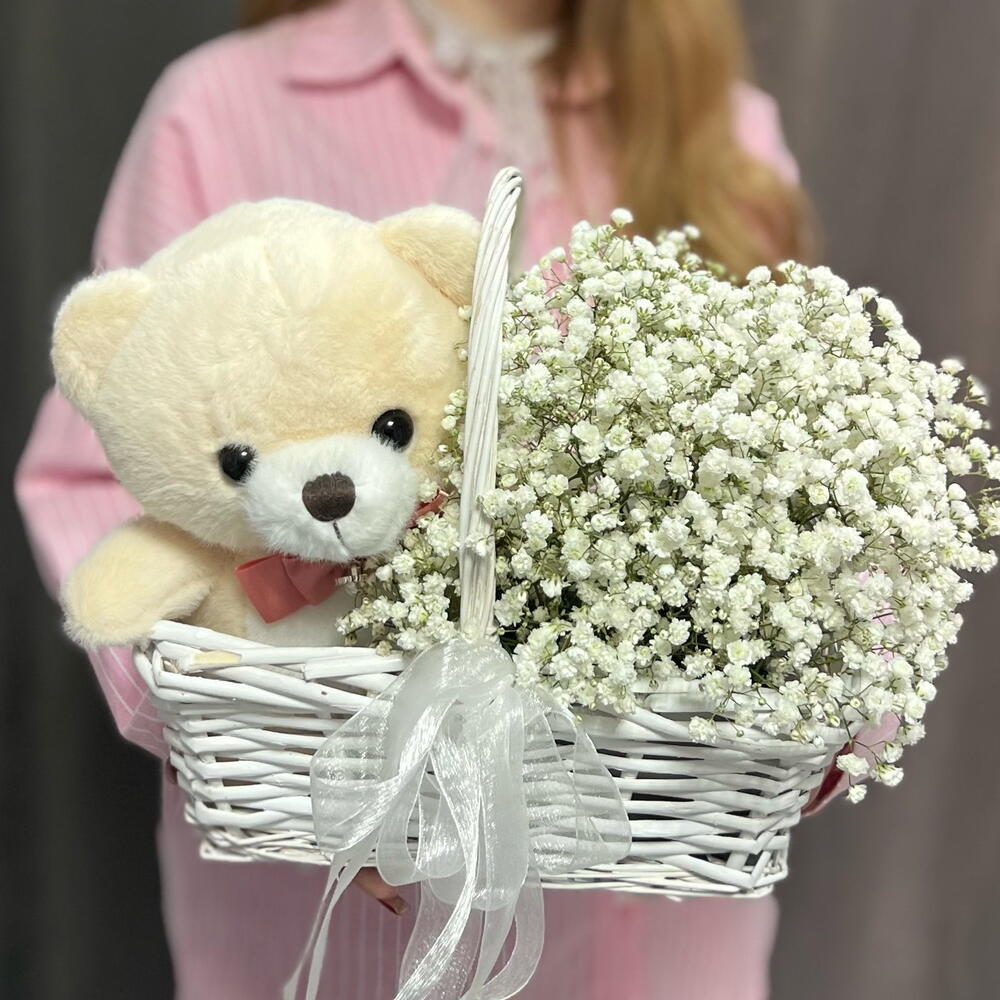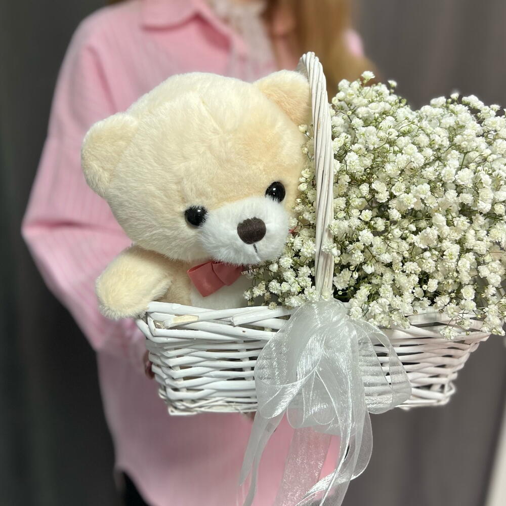 Нежная и трогательная композиция из воздушной белой гипсофилы и мягкой игрушки Мишка — идеальный вариант, если вы хотите купить цветы в корзине в Москве и подарить по-настоящему тёплые эмоции. Цветы аккуратно собраны в стильную плетёную корзину и дополнены декоративной лентой, создавая ощущение уюта и заботы.