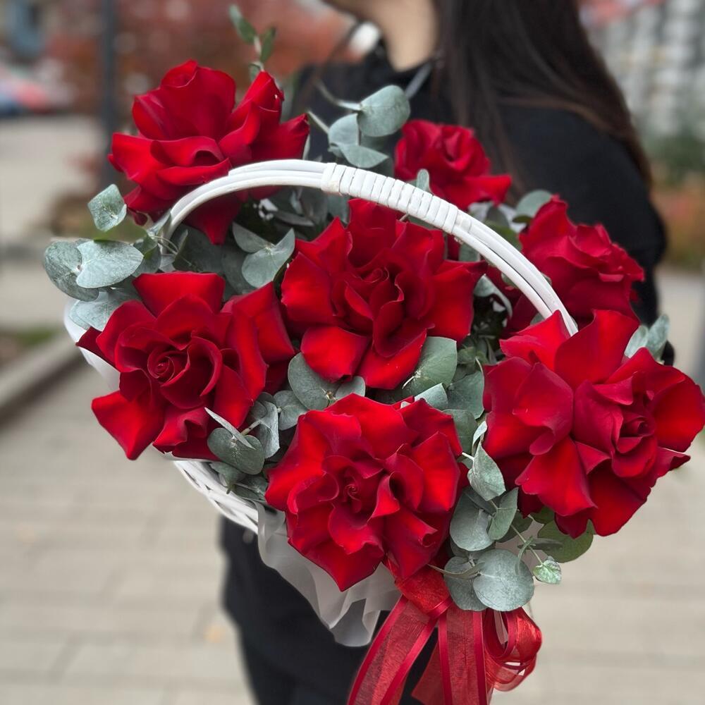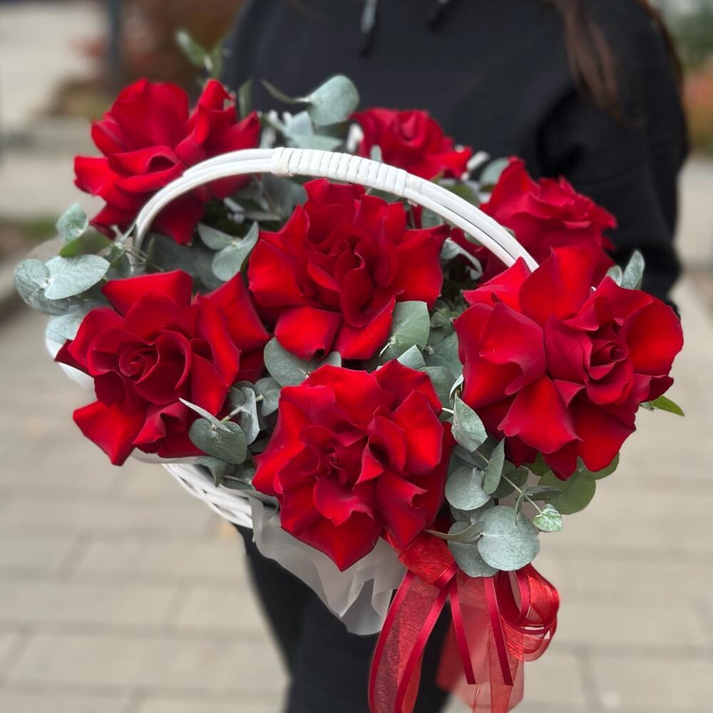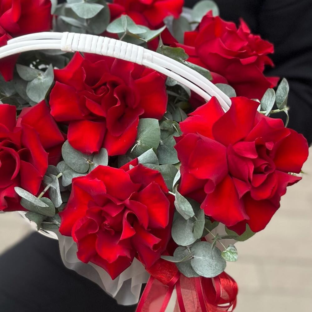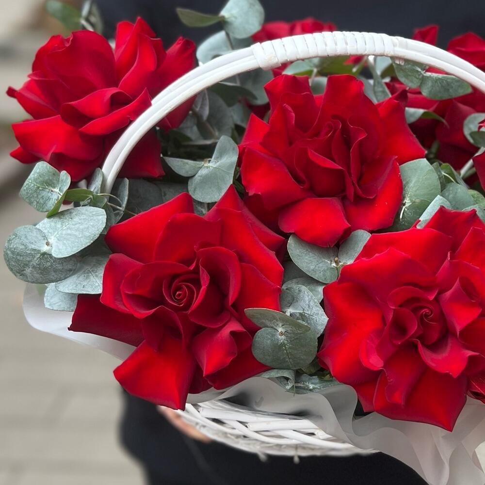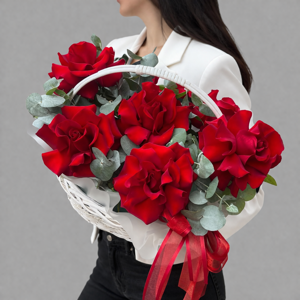 Элегантная цветочная композиция из бархатных красных французских роз и свежего эвкалипта, аккуратно оформленная в плетёной корзине. Глубокий оттенок роз подчёркивает торжественность момента, а эвкалипт добавляет свежесть и деликатный аромат — идеальный подарок для признаний, юбилеев и важных встреч.