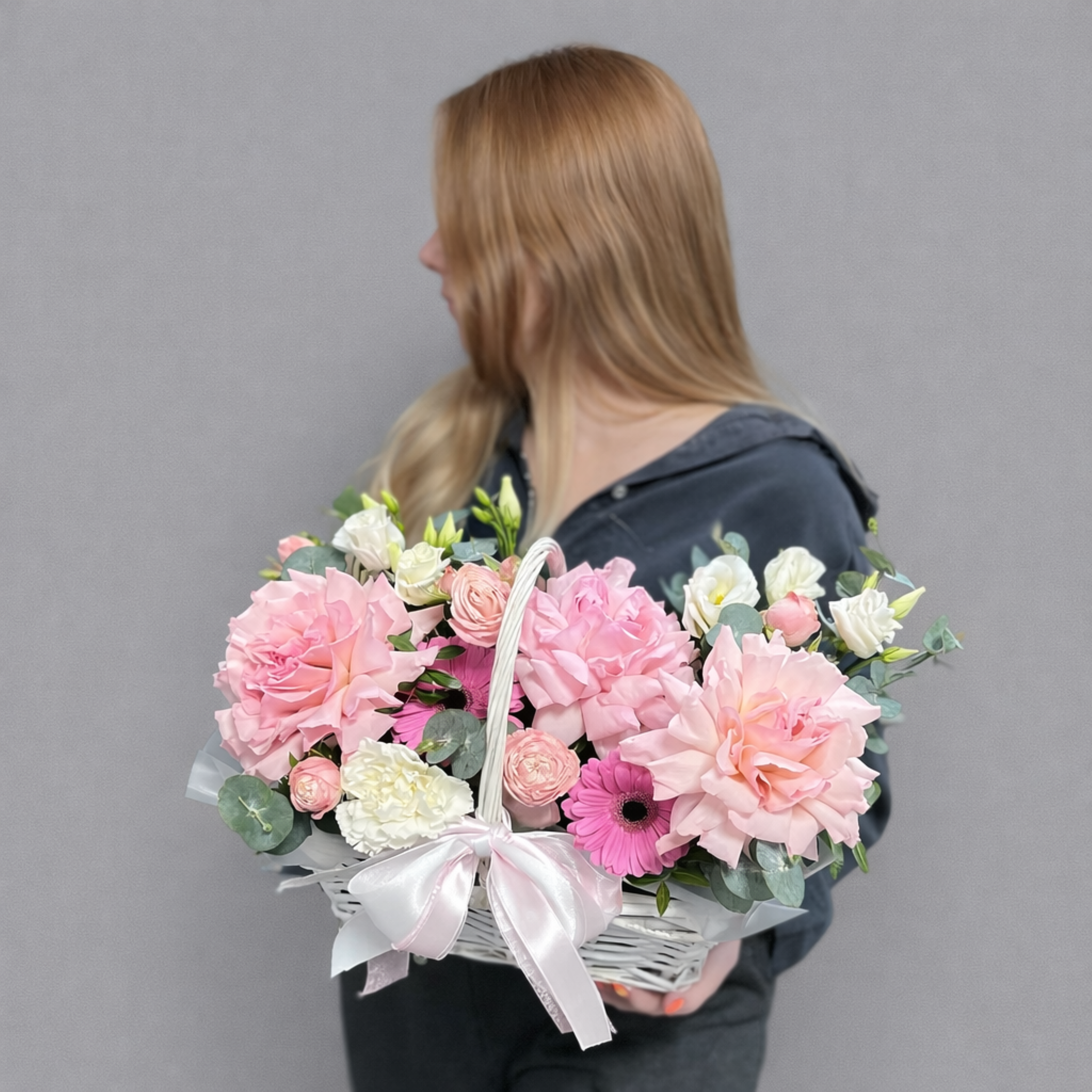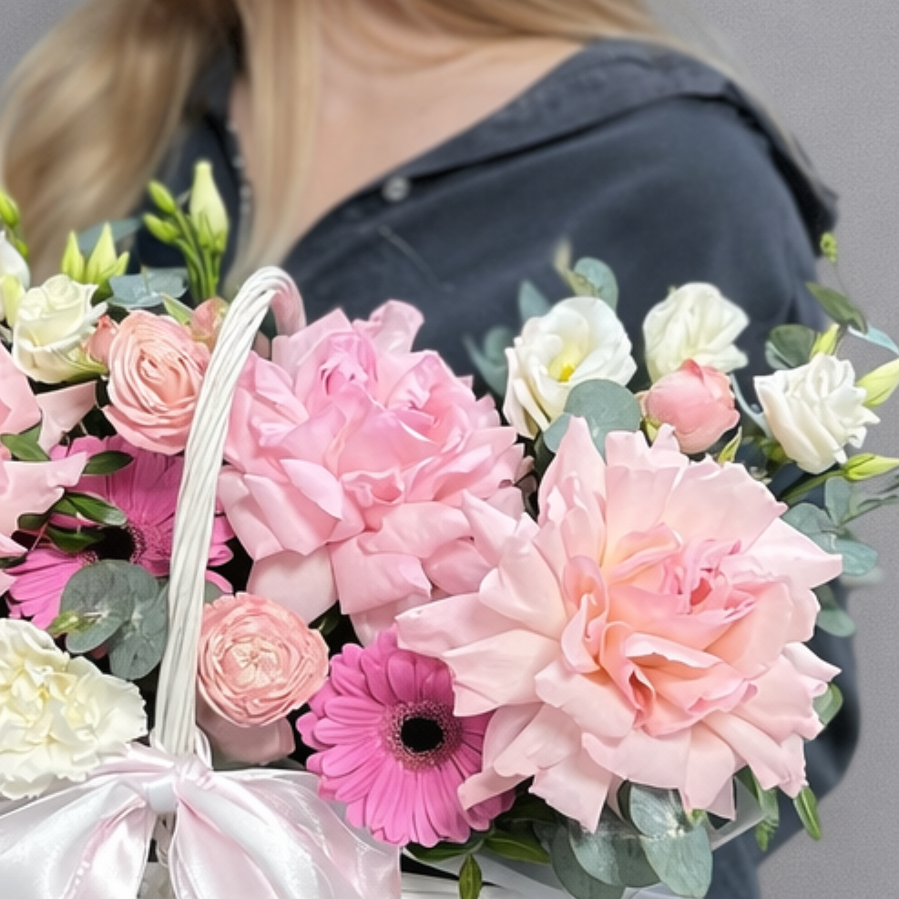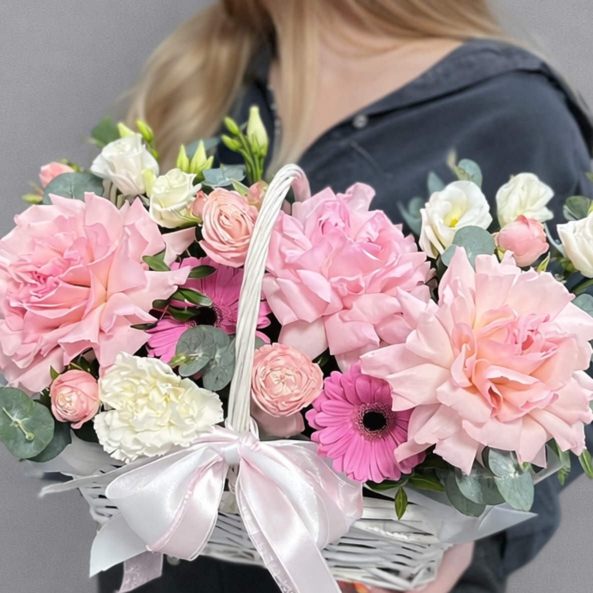 Композиция с розами, герберами, эустомой и гвоздиками в корзине — это красивый и универсальный цветочный подарок, который подарит яркие эмоции и праздничное настроение.