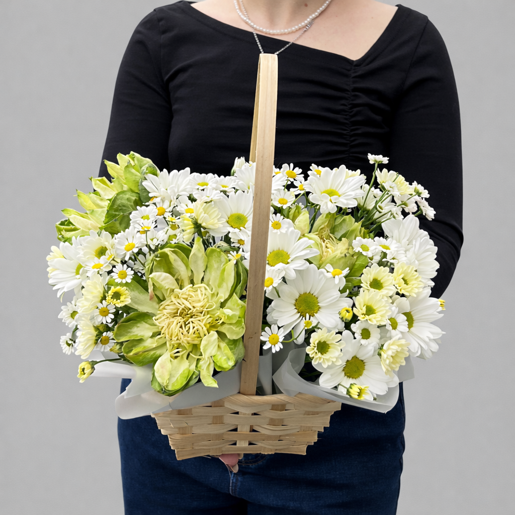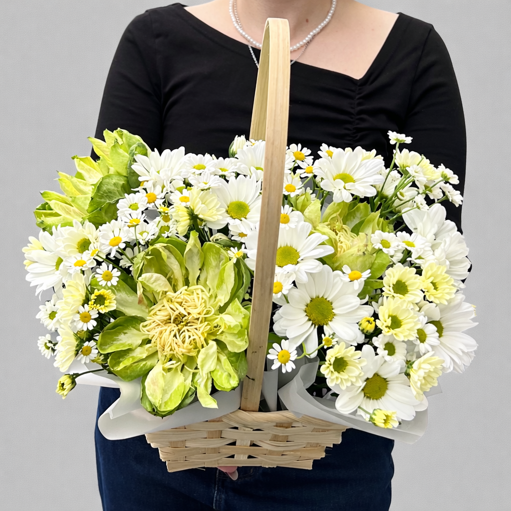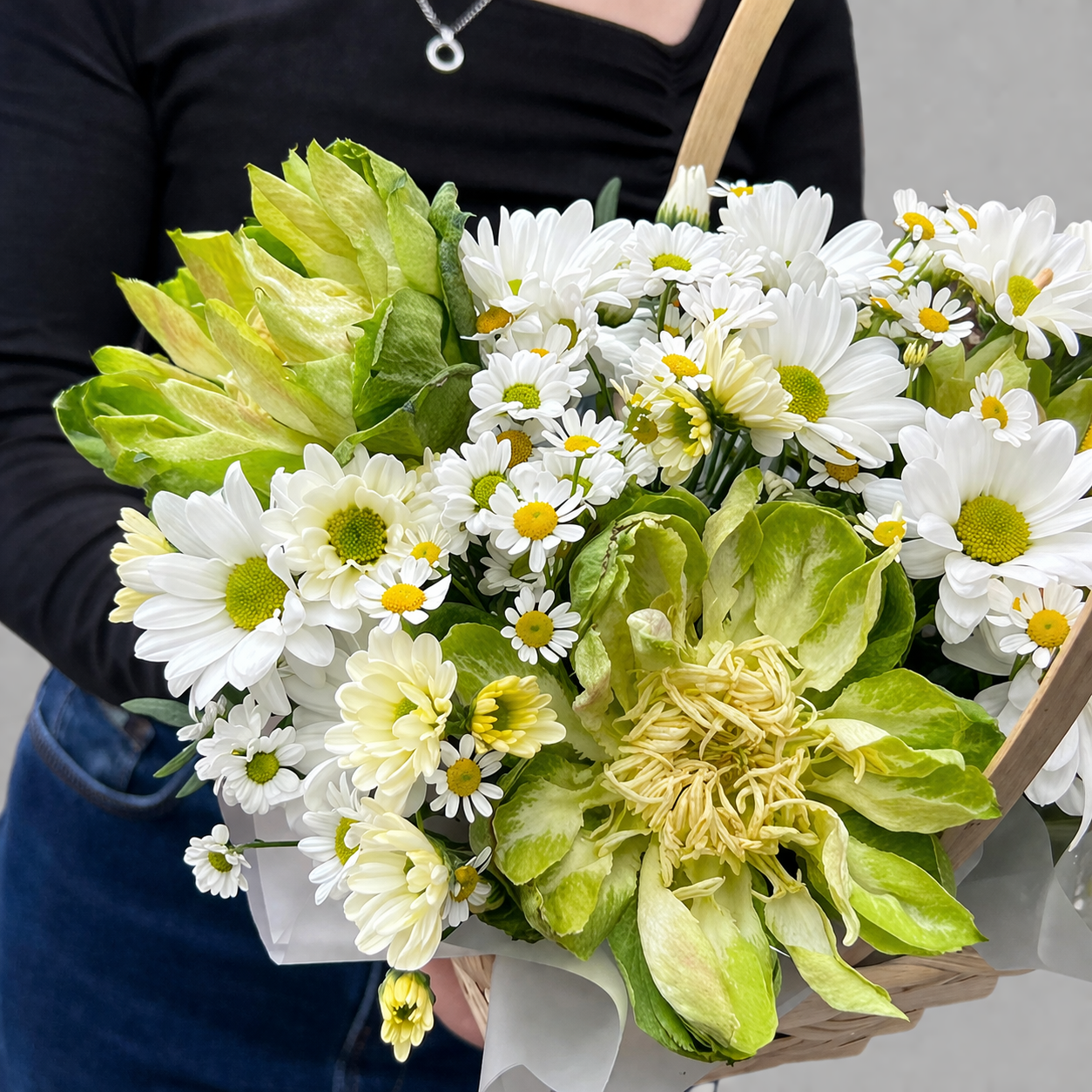 Белые хризантемы придают композиции ощущение свежести, чистоты и гармонии. В сочетании с ромашками и розами они создают светлый, универсальный образ, который подойдет для самых разных поводов и будет уместно смотреться как для близкого человека, так и для официального поздравления.