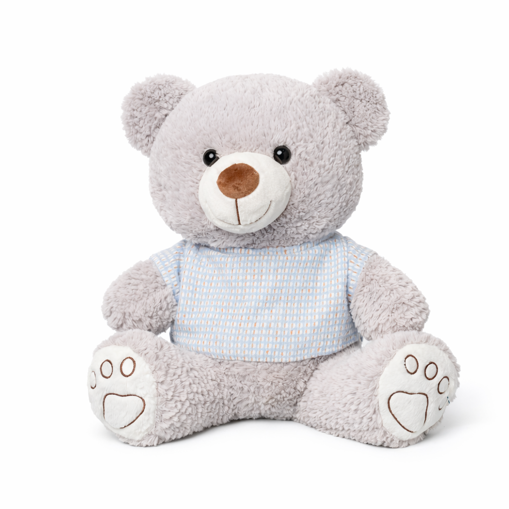 Очаровательный серый плюшевый мишка 40 см в стильной голубой кофточке — это тёплый и душевный подарок для любого возраста. Игрушка выполнена из мягкого текстурного плюша, приятного на ощупь, а аккуратная мордочка с доброй улыбкой делает образ особенно уютным.