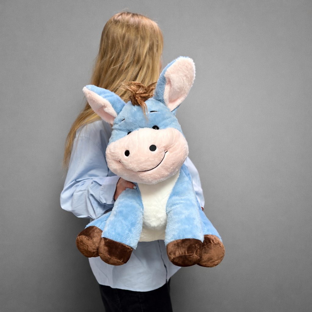 Очаровательный плюшевый ослик 50 см — добрый и необычный подарок, который вызывает улыбку с первого взгляда. Нежный голубой оттенок, мягкий приятный на ощупь плюш и забавная мордочка делают игрушку особенно уютной и запоминающейся.